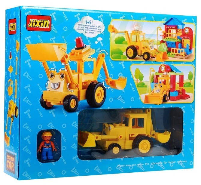 Koparka jeździ, odbija się od przeszkód, porusza buźką i oczkami, ma demontowalną kabinę dla kierowcy, podnoszoną przednią łyżkę i ruchomą koparkę.