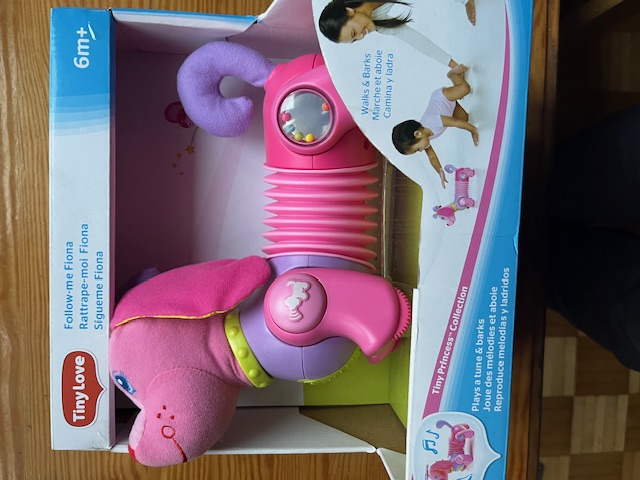 Interaktywny piesek FIONA to prześliczny różowy piesek z szeleszczącymi uszkami i tułowiem - harmonijką. Elastyczny tułów pozwala na poruszanie się zabawki torem prostym oraz okręznym. Jak FIONA zachęca malucha do poruszania się: Piesek rozpoczyna spacerować po delikatnym dotknięciu, po czym zatrzymuje się, ponowne dotknięcie wprawia zabawkę w ruch Fiona poruszając się szczeka i gra miłą dla ucha, wesołą melodię Możliwa jest zmiana prędkości poruszania się pieska.
