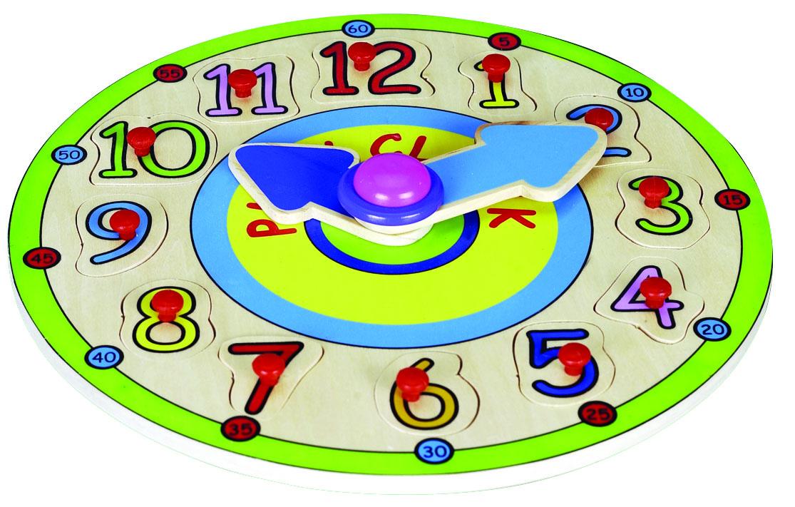 Drewniana ekologiczna bezpieczna układanka z dużymi uchwytami. Zegar to edukacyjne puzzle które rozwijają zdolności motoryczne i logiczne myślenie, uczą małe dzieci rozpoznawania kształtów, kolorów, cyferek a starsze - liczenia, godzin, minut i określania czasu