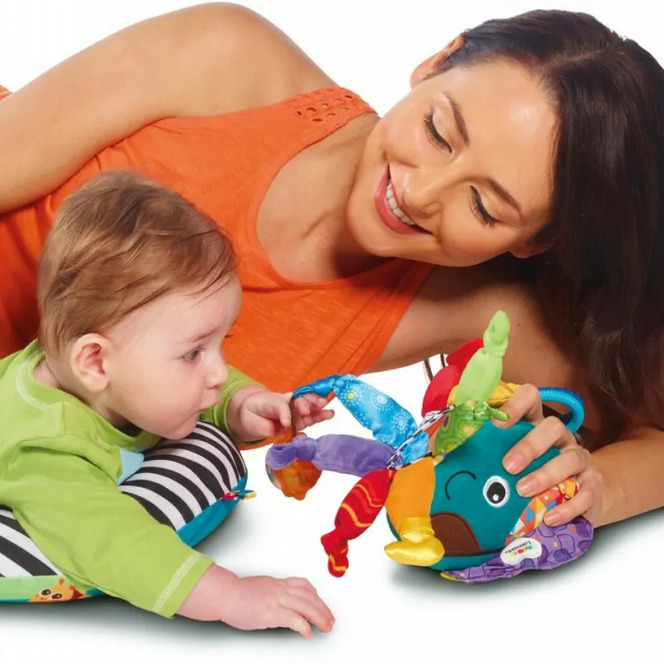 Ciekawe elementy zabawki, takie jak: lusterko, szeleszczący materiał, grzechotki i kolorowe gryzaki rozwijają ciekawość dziecka poprzez nieustanne poznawanie nowych rzeczy w zabawce.