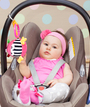 Haftowane oczka, łapki czy ząbki z tasiemek przypominają uśmiechnięte zwierzątko. Żywe kolory piłki kontrastują z biało czarnymi paskami stymulując zmysły dziecka.