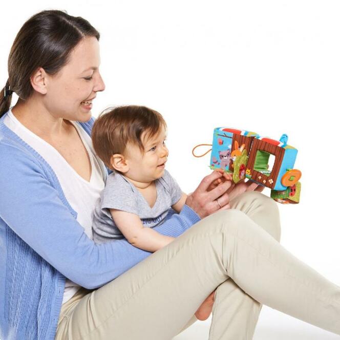Dwustronna rozkładana miękka zabawka dla dzieci zawierająca mnóstwo niespodzianek: gryzak, grzechotkę, szeleściki, lusterko, guzik i pętelkę, książeczkę A-kuku i pętlę do zawieszania