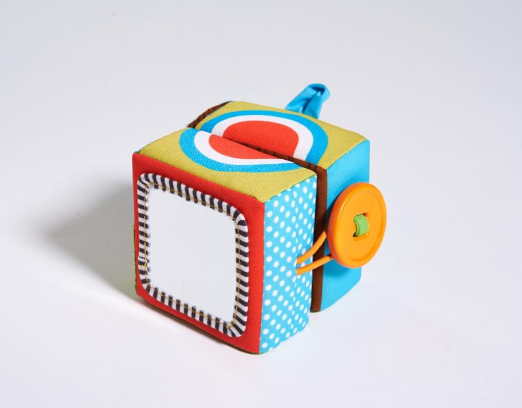 Zabawka posiada pętlę do zawieszania, gryzak, grzechotkę, szeleściki, lusterko, guzik i pętelkę, książeczkę A-kuku.