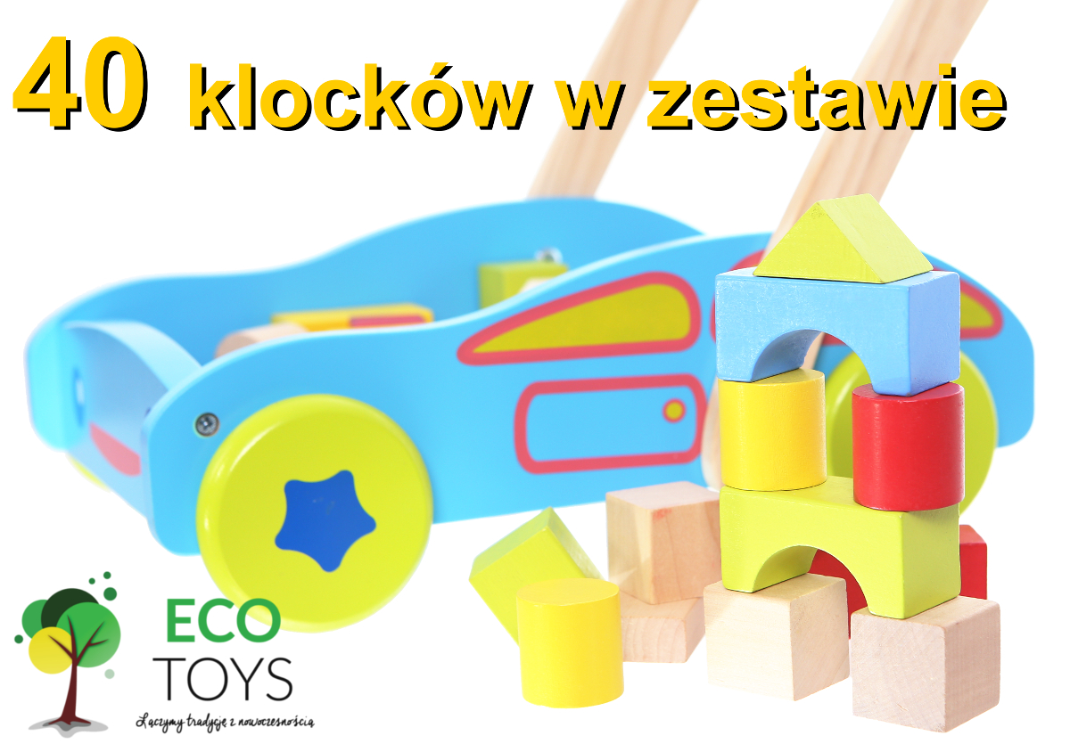 Drewniany wózek firmy EcoToys z klockami to świetna zabawka dla każdego małego dziecka. Dzieci lubią przenosić swoje rzeczy z miejsca na miejsce, a także przepadają za zabawkami pobudzającymi wyobraźnie oraz wykorzystującymi zdolności manualne. W zestawie znajduje się zabawka-pchacz, a także zestaw 40 drewnianych klocków.